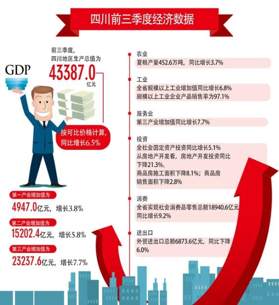 华西都市报讯(记者 朱宁)10月19日,省政府新闻办在成都举行2023年前三季度四川经济形势新闻发布会。根据地区生产总值统一核算结果,今年前三季度四川地区生产总值(GDP)为43387.0亿元,按可比价格计算,同比增长6.5%。
