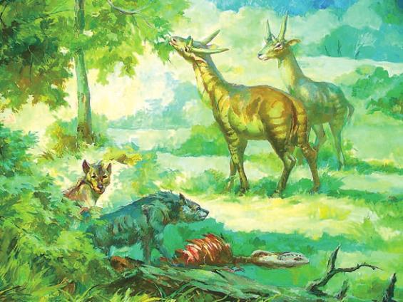 远古动物种群复原图:巨鬣狗。