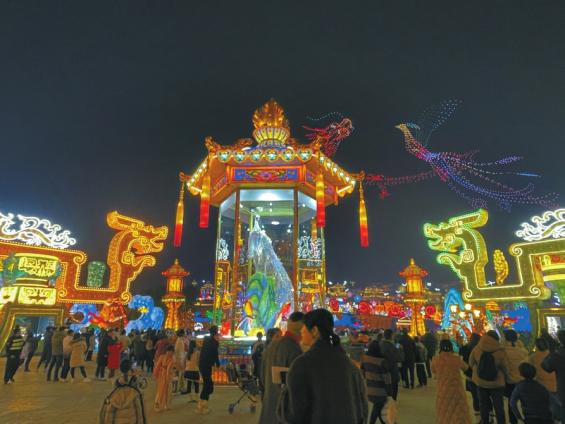 据悉,本届灯会在中华五千年文化长河中撷取素材,通过半年的创意策划,60天匠心制造,以时间为主轴,传统与现代交相辉映,融入“王者荣耀”“泡泡玛特”等顶流IP,精心打造“华夏乐章、盛世欢歌、年味中国、浪漫中国”四大板块,尽力为各方宾朋奉献一场流光溢彩、喜气洋洋的视觉盛宴。开幕式后,各方嘉宾兴致盎然地在园内观灯,零距离感受流光溢彩的彩灯盛宴。