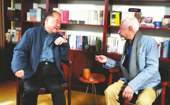 莫言与来自英国的非洲裔诺奖得主、作家阿卜杜勒拉扎克·古尔纳对话。 陈玲玲摄
