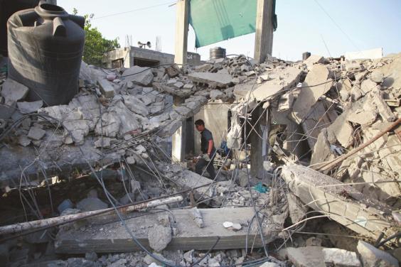 4月24日,在加沙地带南部城市拉法,巴勒斯坦人查看遭袭后的建筑物废墟。新华社发