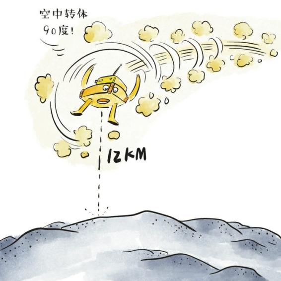 快速调整段:当距离月面大约12公里时,开始姿态调整,发动机逐渐调小推力,“着上组合体”的姿态也逐渐接近垂直于月面。