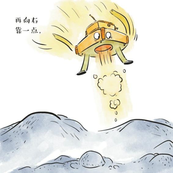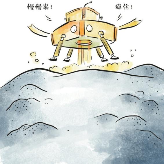 缓速下降段:当降至着陆点上方约30米处,速度减为每秒2米。离月面约2米时,“着上组合体”主发动机关闭,最终,四条缓冲着陆支撑腿稳稳地落在月背南极-艾特肯盆地。