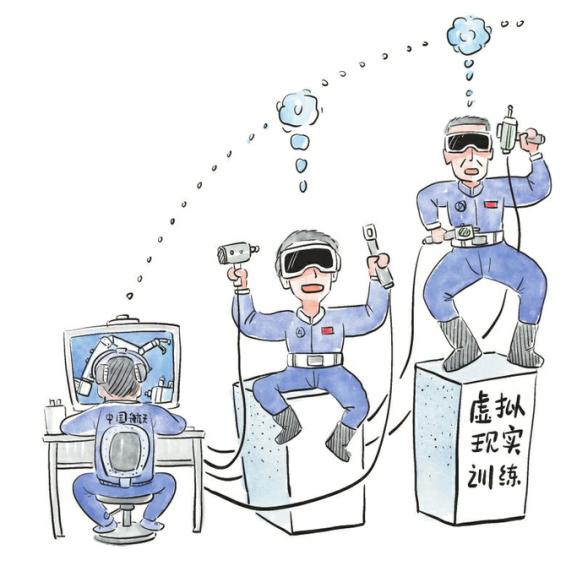 虚拟现实训练器,是航天员进行出舱活动协同训练的重要设施。训练时,2名出舱航天员佩戴虚拟现实眼镜,舱内航天员使用机械臂操作台控制机械臂,三人协同完成出舱活动模拟训练。
