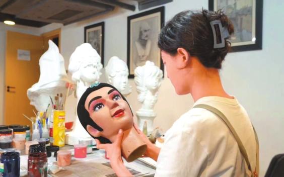 川北大木偶造型师正在给大木偶化妆。周彬摄