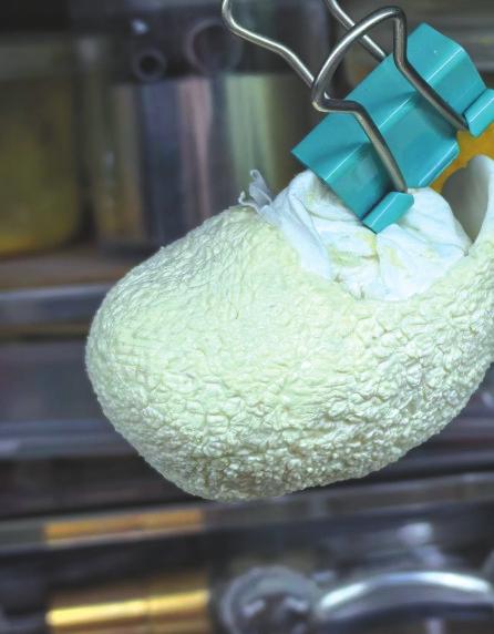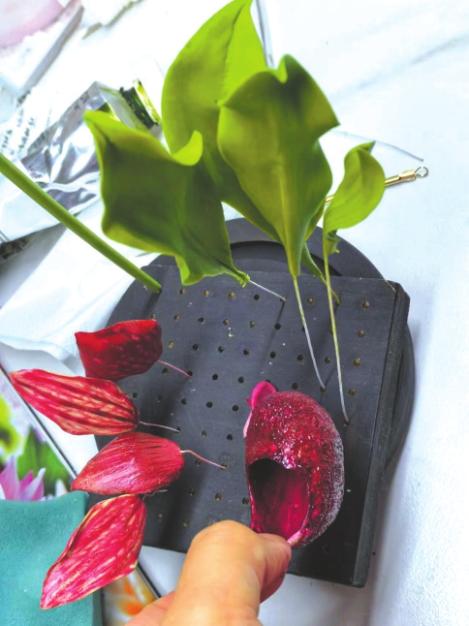 更大的麻烦在后面。口袋状的花瓣表面,是粗糙的纹理。“以前做的花瓣都是光滑的,而这次是全新的尝试。”在洗脸时,看到一旁的个人洁面用具起泡网,周周突然有了想法——把起泡网包裹在做好的一层花瓣上,在起泡网上贴上一层薄的黏土,再把网撕下来。当做完细节处理后,效果出乎意料地好。“很多时候,看似不可能、不搭边的东西,可能带来惊喜。”周周说。
