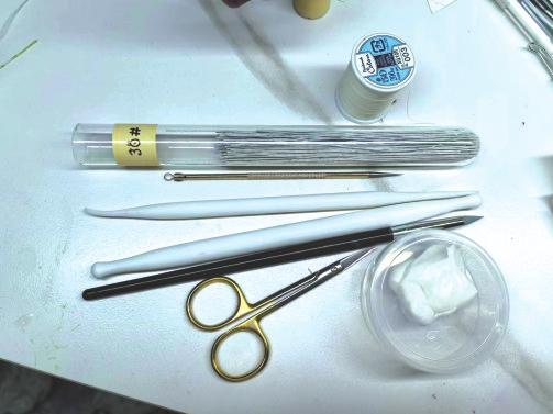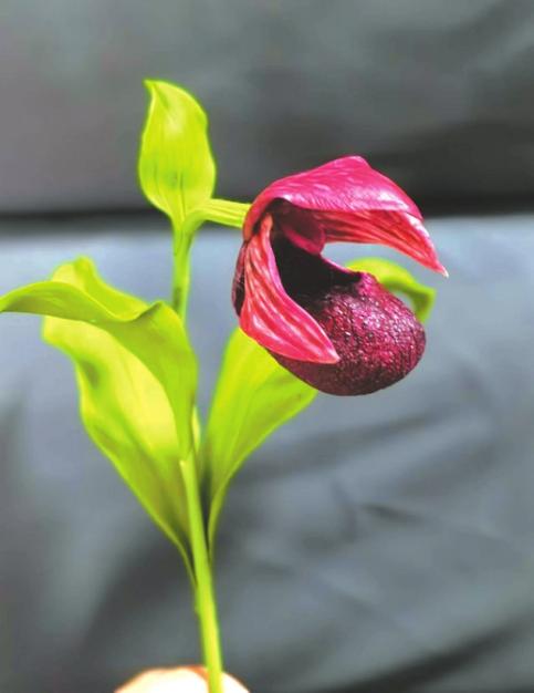 树脂黏土是一种柔软、耐腐性和耐用性强的黏土,有很好的延伸性,易于塑造形状。揉搓树脂黏土,用压面机压到合适的厚度,再用粉刺针裁出花瓣、叶片等造型,接下来,便是用手去塑造形状、用造型棒拉波浪……在还原国家二级保护野生植物西藏杓兰时,周周遇到不小的麻烦——花瓣如开口向上的小口袋,她本想剖成两半,再进行黏合,可做出来的花瓣不自然,“最后还是用整片黏土,用丸棒一点一点压出弧度。”