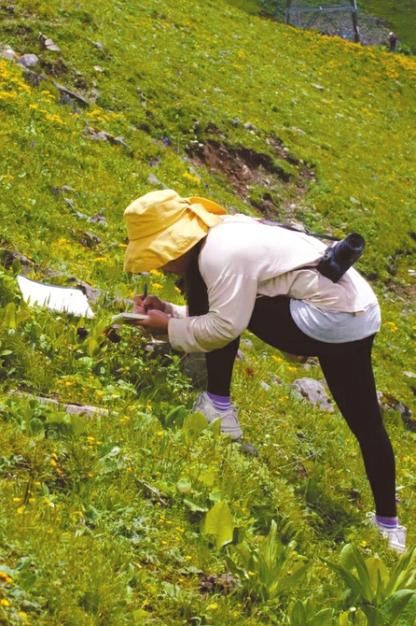 6月30日,在巴朗山海拔3000多米处,各色花草如宝石般镶嵌在山坡上。周周背着相机,手拿本子、直尺、笔,近距离与植物“对话”。由于高山植物大都低矮,大多数时间,她几乎要“贴”在地上拍摄。“比如这个尖被百合,它们都是含羞内向低着头,必须仰拍。”