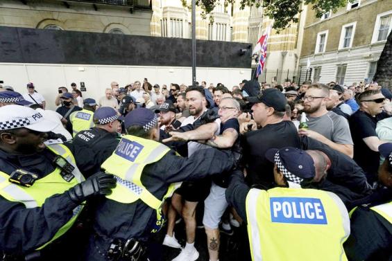 7月31日,在英国伦敦,示威民众与警察发生冲突。图据新华社客户端