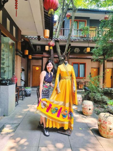 林玉玲是马来西亚第三代华人,从小在吉隆坡长大。今年7月,她来成都参与浓园NY20+国际艺术家驻留计划,用巴蜀文化元素进行蜡染创作。“看,我用蜡染把九寨沟的四季印在了汉服上。”她小心翼翼地将一件黄色的汉服摊开,袖口绣着精致的配饰,裙摆染上了四个图案,分别是九寨沟春夏秋冬的不同景色,这也是她首次将蜡染与汉服结合。