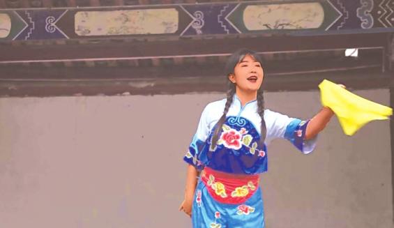 and a female lead. The clown, characterized by the white paint on his nose, is humorous in his speech and is commonly known as“Painted-nose”. The female lead, who dresses as an married village woman, is vixenish and straightforward and is called“Little Sister”. On stage, they play off each other. Their performance, in addition to speaking, imitating, teasing and nging, involves larger tricks such as shrugging, waddling and swinging. The“Duck-Like Step” earns its name from its waddling manner.