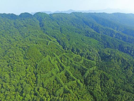 邛崃天台山镇当年林场工人种植下的鹅掌楸在空中看起来像一个“犇”字。