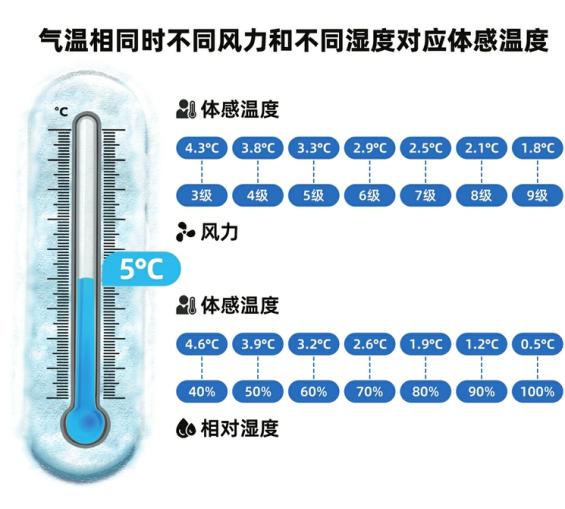 人们常说的气温,是空气的温度,而人体对周围环境的冷暖感知,则要看体感温度。体感温度与气温、风力、相对湿度等密切相关。根据中央气象台体感温度公式计算可知,同样是5℃的气温,如果相对湿度达70%,那么体感温度只有2.6℃;如果相对湿度增加到90%,体感温度则只有1.2℃。5℃的气温下刮起7级大风,体感温度仅2.5℃。如果有9级大风,体感温度则会低至2℃以下。