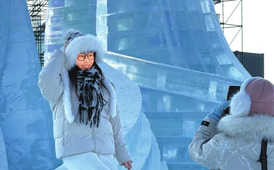 身着御寒衣服在黑龙江哈尔滨冰雪大世界园区内拍照的游客。新华社发