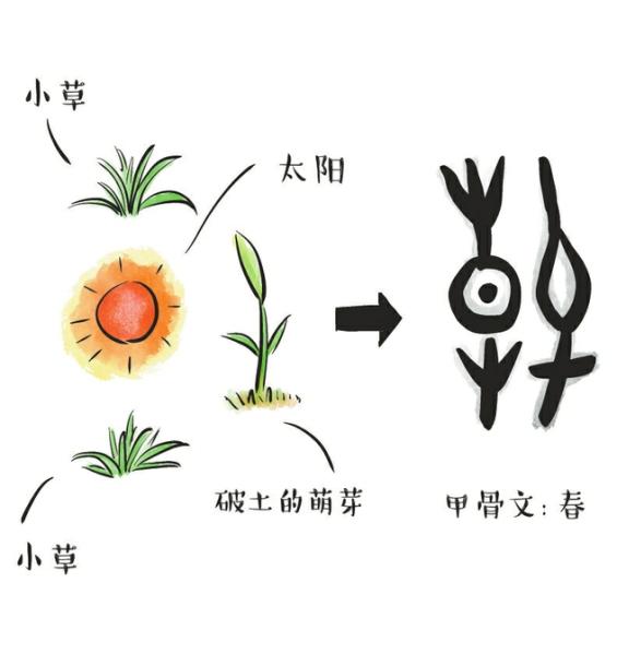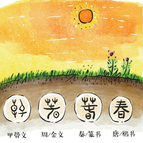 但不论是现代字典,还是清代的《康熙字典》,“春”字皆归入“日”部,看不出草木萌芽的内涵。其实,在早期汉字中,“春”字均与“草”有关,如从殷墟出土的甲骨卜辞上发现 的“春”字,就有草的形象。