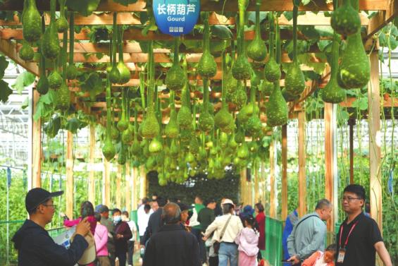2025年4月20日,第二十六届中国(寿光)国际蔬菜科技博览会上展示的长柄葫芦。 新华社发