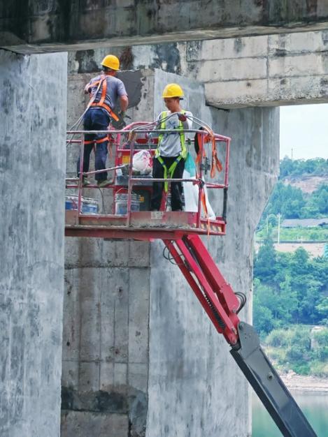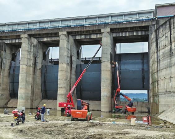 施工人员对闸门柱体进行修复。李兴罡 摄