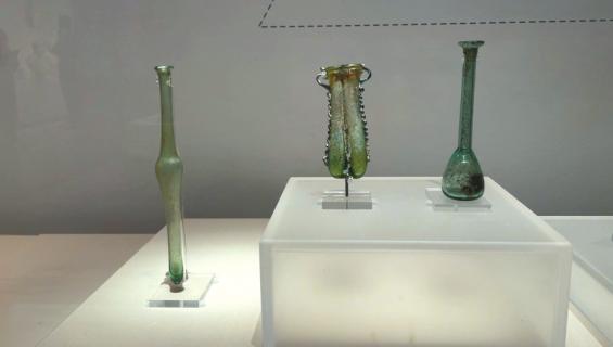 在雕像之外,展览还展出了古希腊陶器,以及10余件古罗马玻璃器,还有马赛克镶嵌地板等展品。其中,晶莹剔透的玻璃器物,折射出罗马帝国的琉璃万象。透过展览上的文字可知,当罗马征服了地中海沿岸,占领了希腊世界的两个玻璃中心,同时玻璃生产发生了一场大革命,使得玻璃器从昂贵的奢侈品变成了寻常的日用器皿,成为罗马帝国最繁盛的手工业商品之一。