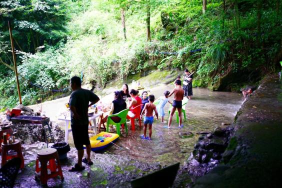 8月3日,成都大邑县一条溪水边,市民在水中乘凉。杨涛 摄