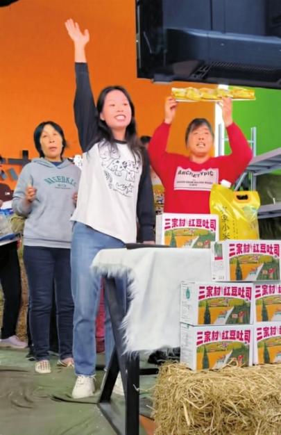 张桂芳(前排左)带领村民在直播间销售特色农产品。