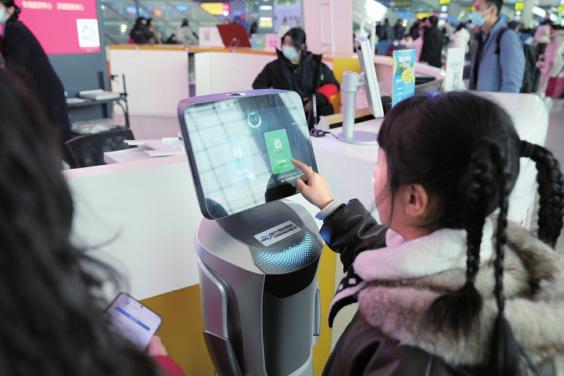 2月2日,一名儿童在铁路成都东站操作“列车查询机器人”。 新华社发