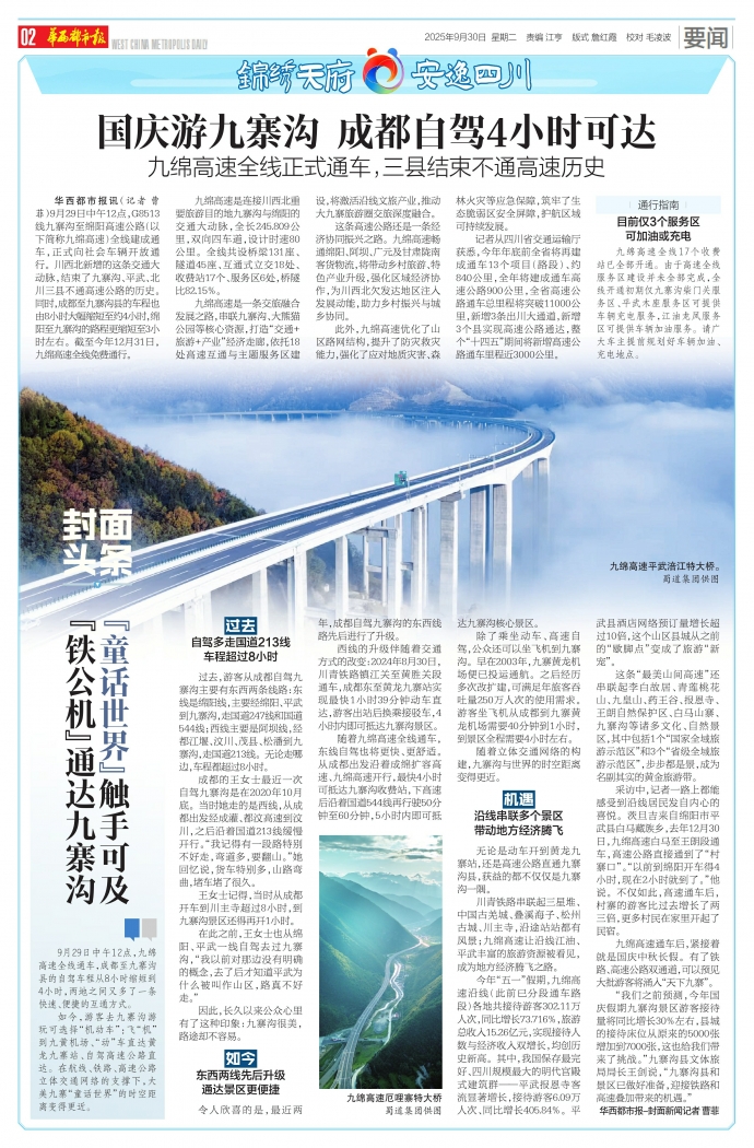 9月29日中午12点,九绵高速全线通车,成都至九寨沟县的自驾车程从8小时缩短到4小时,两地之间又多了一条快速、便捷的互通方式。