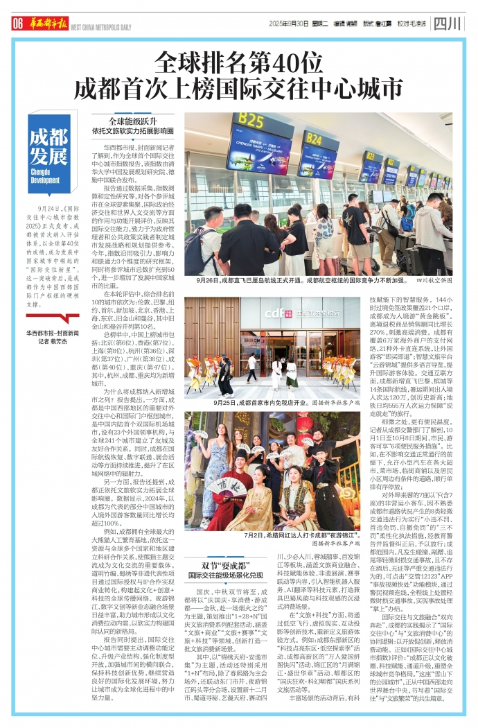 9月24日,《国际交往中心城市指数2025》正式发布,成都被首次纳入评估体系,以全球第40位的成绩,成为发展中国家城市中崛起的“国际交往新星”。这一突破背后,是成都作为中国西部国际门户枢纽的硬核支撑。