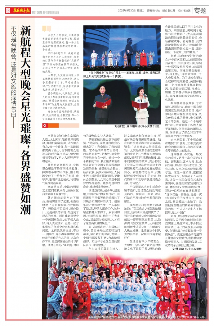 现场还有不少年轻观众。大学生王宇轩说:“我之前对传统文化不是很了解,但这台晚会让我重新认识了四川文化的魅力。川剧变脸、蜀绣展示这些节目太精彩了,尤其是川剧演员瞬间变换脸谱的时候,全场都在欢呼。看完晚会,我的旅游激情被点燃,打算国庆假期去四川的景点逛一逛,亲身感受一下这片土地的魅力。”