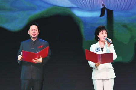 刘劲(左)、温玉娟朗诵《给心灵放个假》。