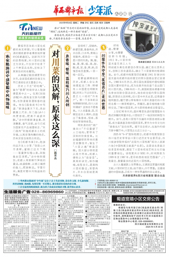 2025年“6·9”国际档案日,成都市档案馆联合四川省历史学学会川菜口述历史专业委员会、四川旅游学院申报的“近现代川菜档案”成功入选第六批《中国档案文献遗产名录》。这是该名录首次收录菜系档案,展现了川菜传统技艺和文化价值的重要地位。该档案共计9281件,时间跨度为1909年至1987年,是目前西南地区范围最广、门类最全、数量最多的近现代川菜档案。