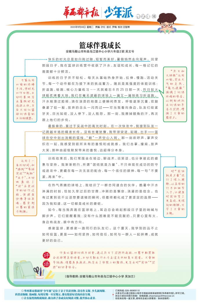 作者以篮球训练为线索,通过烈日下坚持折返跑、比赛中默契配合进球等具体场景,生动勾勒出汗水与友谊交织的夏日图景。文章细节饱满、情感层层递进,既写出了体能上的磨练,更写出对“团结”“坚持”的切身体会。