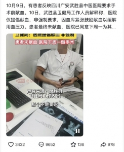 10月13日,涉事的武胜县中医院相关负责人向华西都市报、封面新闻记者表示,医患双方在沟通中对用血政策的理解存在偏差,并强调医疗机构从未规定“不献血就不予用血”。