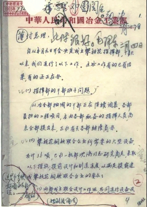 1965年3月4日,毛主席在《关于加快攀枝花钢铁基地建设的报告》上批示“此件很好”。中央档案馆藏