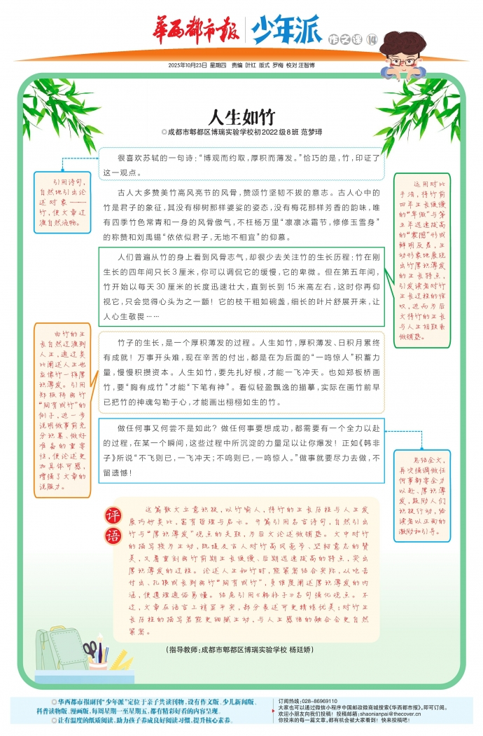 这篇散文立意积极,以竹喻人,将竹的生长历程与人生发展巧妙类比,富有哲理与启示。开篇引用名言诗句,自然引出竹与“厚积薄发”观点的关联,为后文论述做铺垫。文中对竹的描写较为生动,既提及古人对竹高风亮节、坚韧意志的赞美,又着重刻画竹前期生长缓慢、后期迅速拔高的特点,突出厚积薄发的过程。论述人生如竹时,能紧密结合实际,从吃苦付出、扎根成长到画竹“胸有成竹”,多维度阐述厚积薄发的内涵,使道理通俗易懂。结尾引用《韩非子》名句强化观点。不过,文章在语言上稍显平实,部分表述可更精炼优美;对竹生长历程的描写若能更细腻生动,与人生感悟的融合会更自然紧密。