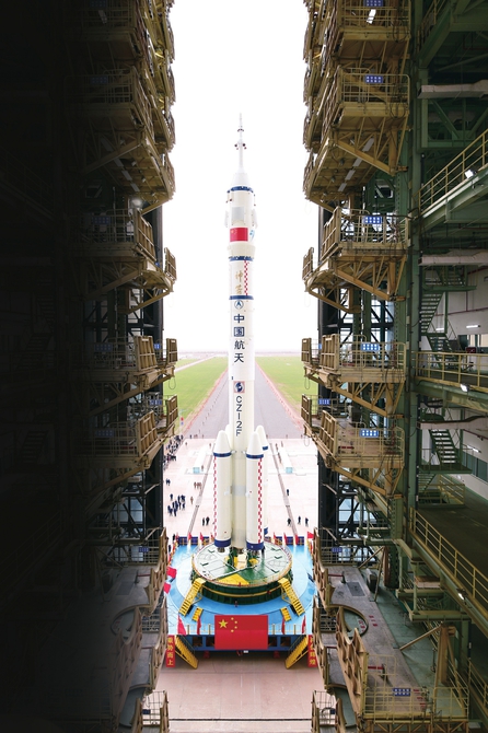 10月24日,神舟二十一号载人飞船与长征二号F遥二十一运载火箭组合体开始转运。新华社发