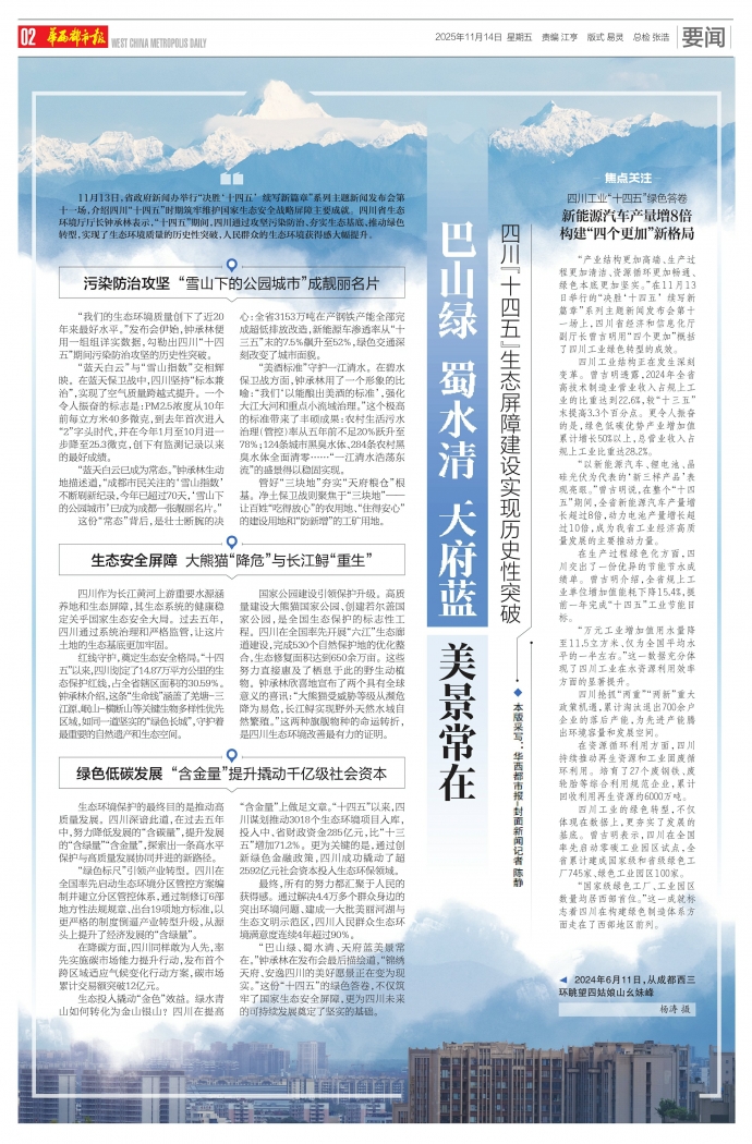 “巴山绿、蜀水清、天府蓝美景常在。”钟承林在发布会最后描绘道,“锦绣天府、安逸四川的美好愿景正在变为现实。”这份“十四五”的绿色答卷,不仅筑牢了国家生态安全屏障,更为四川未来的可持续发展奠定了坚实的基础。