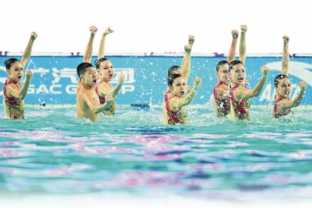 四川花样游泳队在集体技术自选比赛中。新华社发