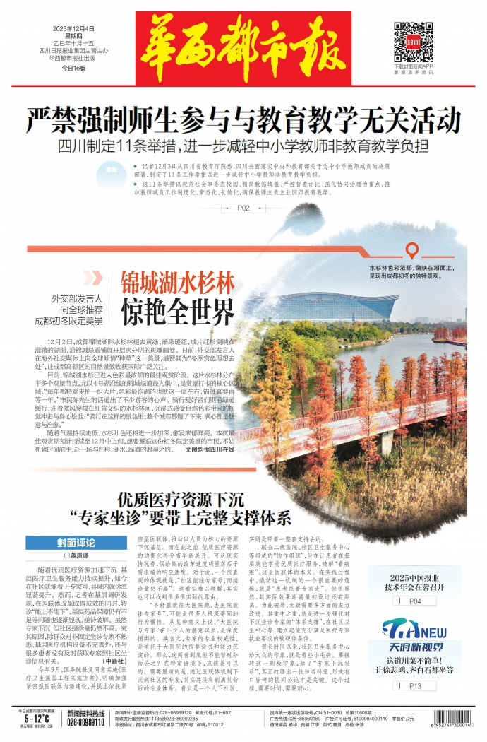 12月2日,成都锦城湖畔水杉林褪去黄绿、渐染暖红,成片红杉倒映在澄澈的湖面,沿锦城绿道铺展开层次分明的斑斓画卷。日前,外交部发言人在海外社交媒体上向全球倾情“种草”这一美景,盛赞其为“冬季赏色理想去处”,让成都高新区的自然景致收获国际广泛关注。