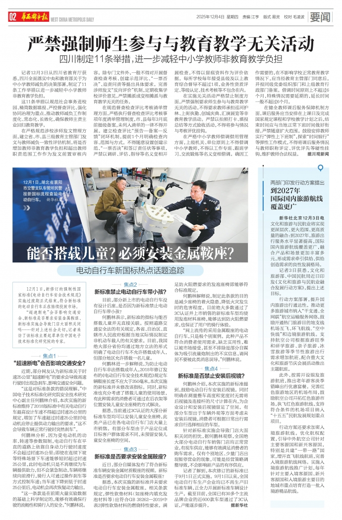 记者12月3日从四川省教育厅获悉,四川全面落实中央和教育部关于为中小学教师减负的决策部署,制定了11条工作举措以进一步减轻中小学教师非教育教学负担。