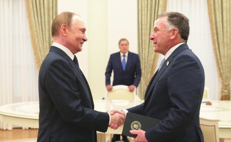 8月6日,在俄罗斯首都莫斯科,俄总统普京(左)在克里姆林宫会见美国中东问题特使威特科夫。 图据新华社客户端