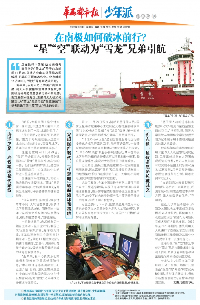 近年来,从九天之上的国产海洋卫星,到无人机在极寒空域精准盘旋,中国极地科考的自主创新之路不断延伸。面对复杂冰情海况,卫星与无人机如何联动,为“雪龙”兄弟寻找“最佳路线”?记者连线了国内及“雪龙”号上的专家。