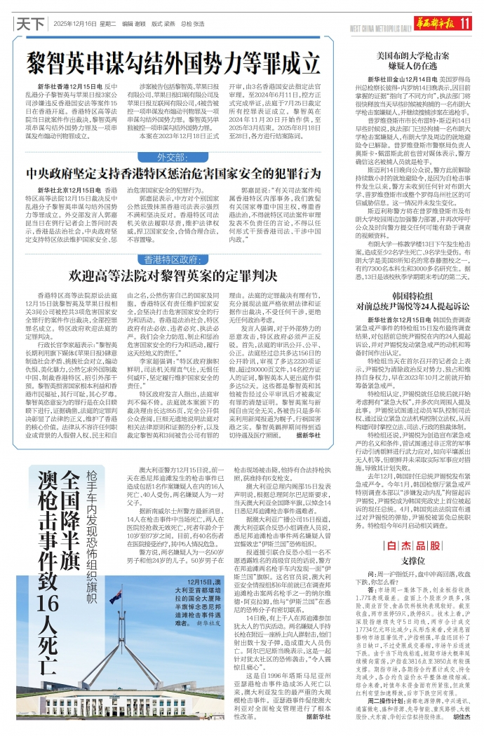新华社香港12月15日电 反中乱港分子黎智英与苹果日报3家公司涉嫌违反香港国安法等案件15日在香港开庭。香港特区高等法院当日就案件作出裁决,黎智英两项串谋勾结外国势力罪及一项串谋发布煽动刊物罪成立。