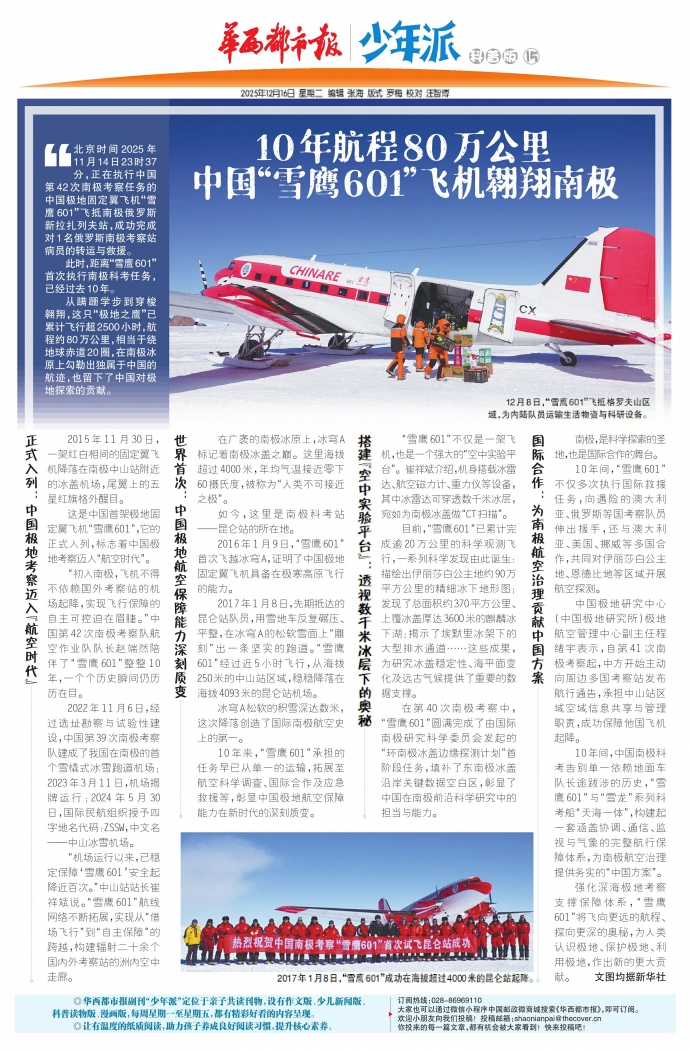 强化深海极地考察支撑保障体系,“雪鹰601”将飞向更远的航程、探向更深的奥秘,为人类认识极地、保护极地、利用极地,作出新的更大贡献。 文图均据新华社