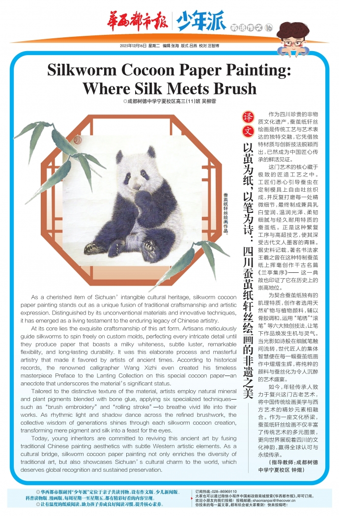 Today, young inheritors are committed to reviving this ancient art by fusing traditional Chinese painting aesthetics with subtle Western artistic elements. As a cultural bridge, silkworm cocoon paper painting not only enriches the diversity of traditional art, but also showcases Sichuan’s cultural charm to the world, which deserves global recognition and sustained preservation.