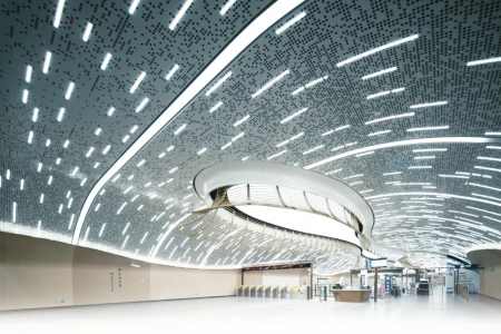 30号线珠江路站——该站围绕“穿越之门”的设计理念,利用张力十足的线条灯光,巧妙划分空间层次,远远看去,两侧灯箱仿佛巨大的“时空之眼”,助你踏上未来之旅。