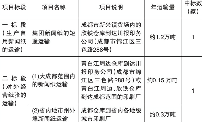 1、项目名称:四川日报报业集团出报用新闻纸及物贸公司经营纸张运输业务采购招标