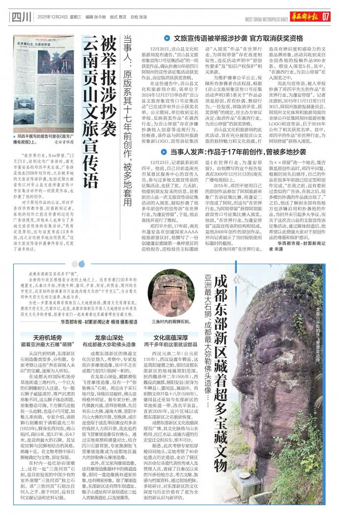 对于原创作品的认证,邓四平告诉华西都市报、封面新闻记者,在他的创作之前没有看到过这句广告语使用,而他本人也参与了多地文旅宣传语的征集活动,“我肯定是原创,这句话发布在10多年前,这之后还被多地沿用获奖。”这场文旅宣传语抄袭事件背后,引发了诸多热议。