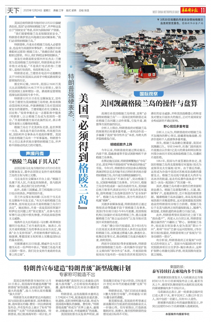 此外,特朗普希望在美国历史上留下其“政治遗产”。再度入主白宫以来,特朗普显露出强烈的“开疆拓土”野心。除格陵兰岛外,他还放言将加拿大变为美国“第51个州”,称将“夺回”巴拿马运河控制权。《华尔街日报》报道说,特朗普将领土扩张视为“自身功绩的一部分”。