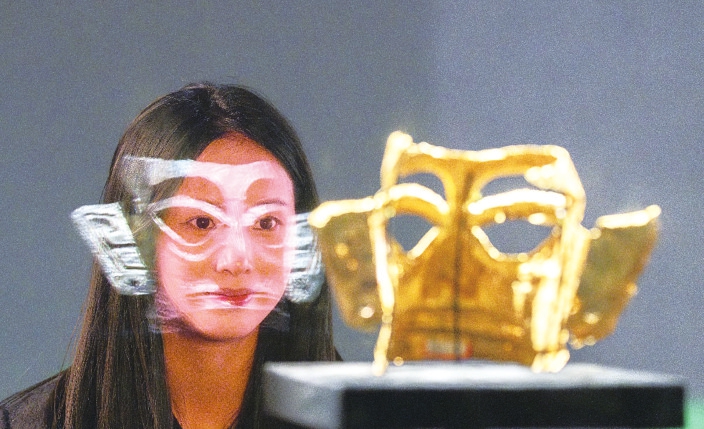 参观者在三星堆博物馆新馆展厅内观看展出的黄金面具。新华社资料图片