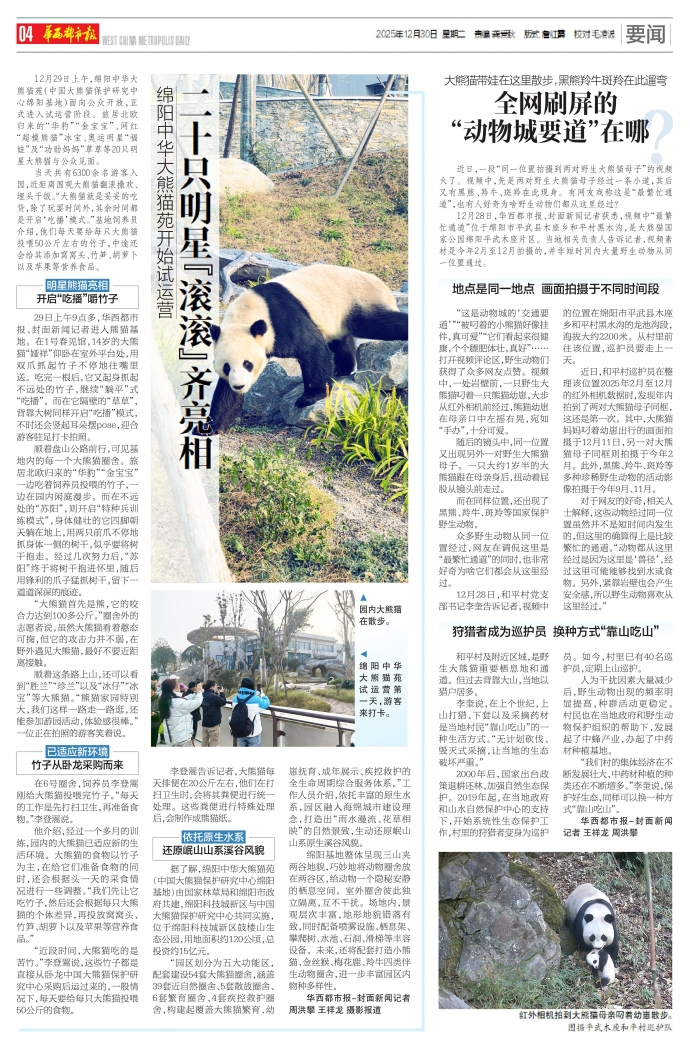 12月29日上午,绵阳中华大熊猫苑(中国大熊猫保护研究中心绵阳基地)面向公众开放,正式进入试运营阶段。旅居北欧归来的“华豹”“金宝宝”、网红“超模熊猫”冰宝、奥运明星“福娃”及“功勋妈妈”草草等20只明星大熊猫与公众见面。